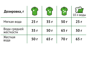 Предварительно отсортируйте одежду по цвету, типу ткани и степени ее загрязнения. Перед стиркой ознакомьтесь с информацией, указанной производителем на ярлыке изделия. Для достижения лучшего результата стирки установите наиболее высокую допустимую температуру, указанную на ярлыке, и следуйте рекомендациям по дозировке (см. таблицу). Перед первой стиркой изделия протестируйте средство на незаметном участке одежды.